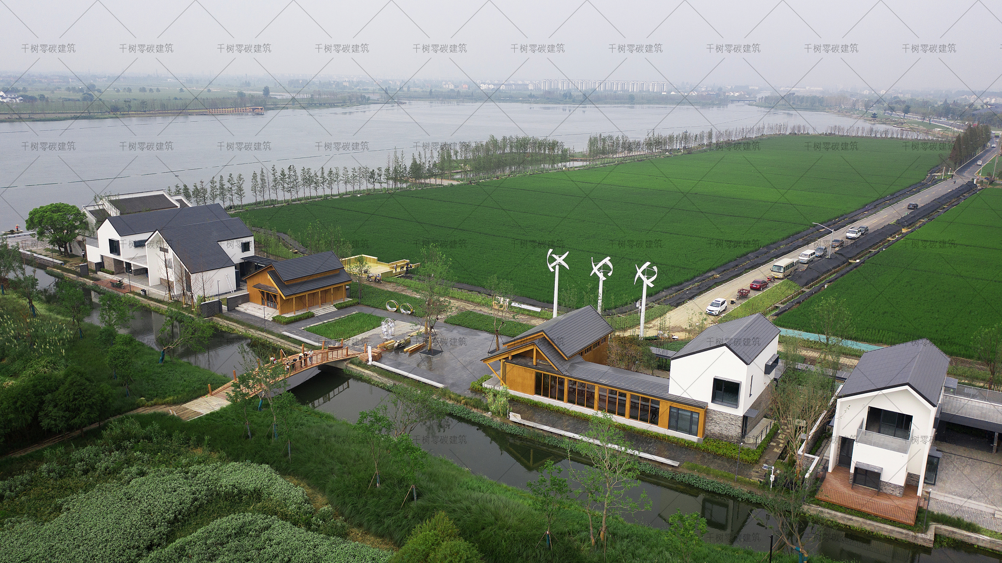 竹小汇科创聚落是全国首个零碳聚落样板示范点,其中办公组团一、办公组团二、办公组团三、办公组团四、办公组团五和访问楼为超低能耗建筑、报告厅木屋为实时零碳建筑;展示中心木屋为全生命周期零碳建筑。