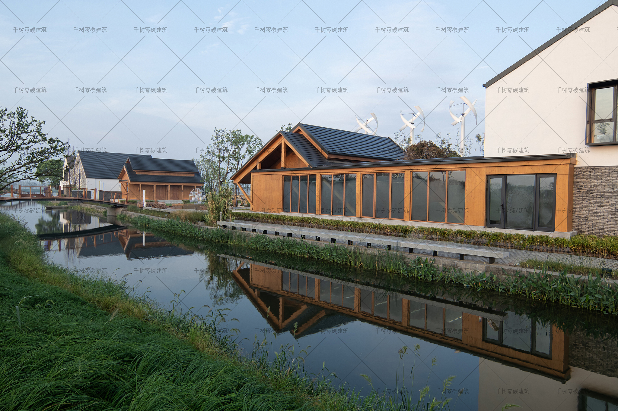 报告厅木屋和展示中心木屋墙面采用隔气膜+内外双层保温(内保温184mm厚,外保温70mm厚)+CLT正交胶合木饰面板,屋面采用隔气膜+保温(屋面保温235mm厚)+光伏瓦的围护结构,门窗采用被动式节能阻燃木门窗(内置遮阳百叶),加上高能效的技术设备:地源热泵系统、风力发电系统、建筑光伏一体化系统、光储直柔系统、热回收系统,通过可视化的智慧运维管理平台高效监管、智慧运算,综合管控与整治,最终实现了零碳建筑的目标。