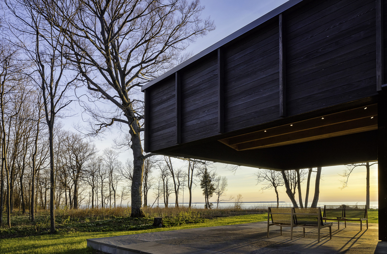 暴露在外的木梁摆放位置使得整个室内空间里的拱顶看起来并不对称。在小木屋的南端,6米长的悬梁屋顶延伸至观景休息平台,屋顶为其提供了一种保护,同时对密歇根湖和周围的美景一览无余。