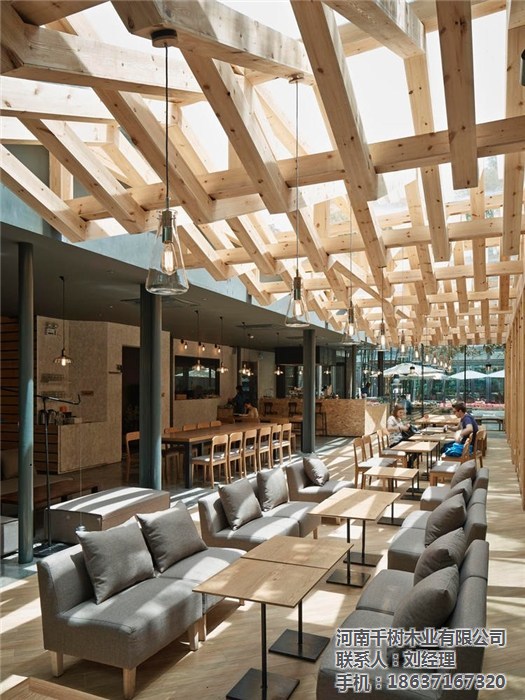值得一说的是建筑玻璃屋顶的双层方管结构,设计团队在这一结构本身的基础上,加入了温暖的原木色木梁,并按照编织纹理的式样加以组织,看上去颇为有趣。