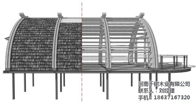 ▼建筑内外清晰可见拱梁和圆木构成的完整结构体系