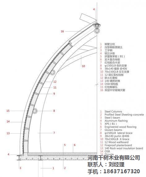 拱形的船身结构,由四组三铰拱木拱梁通过五根圆木连接为整体,每组三铰拱由左右两个对称半拱吊装拼接,而每个半拱又由两道十一公分宽的北美花旗松胶合拱梁组合成,拱顶的小交叉真实反应拱结构的对接特征。采用三铰拱的形式,避免了木材因过度弯曲而产生超限的应力。整个屋面系统保持在拱梁的厚度之中,内部红雪松挂板使用水性清漆保持原木纹理和触感,外部使用了三种尺寸的红雪松木瓦上下微错的铺装方式,质感自然。