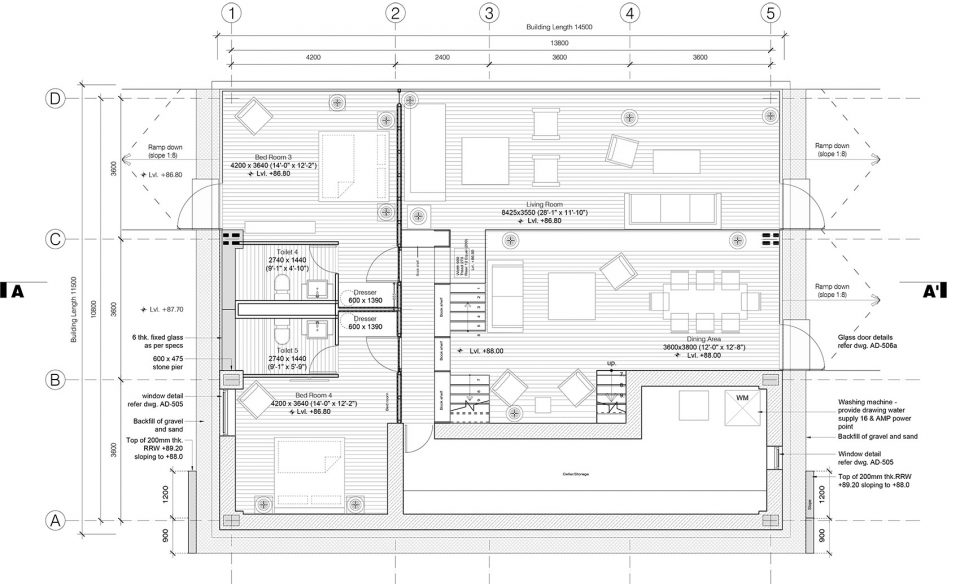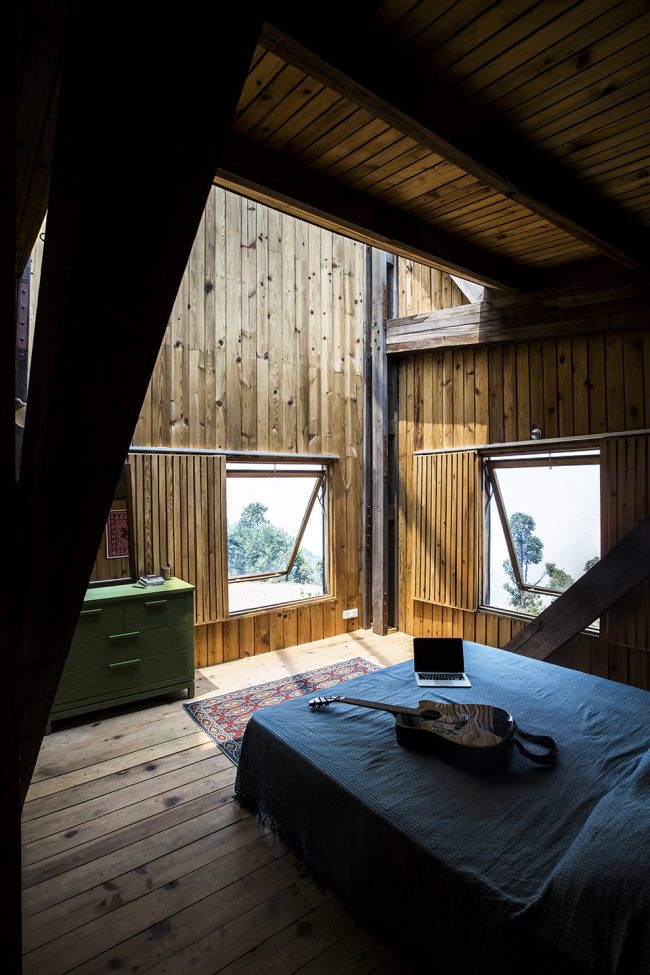 空间由三个不同的层次组成,每一个都大约占用14.5米x3.6 m的自然地形,外立面的连续横窗使得周围的果园和Almora镇的壮观景色一览无余。这个开窗像是一个裂缝,成为现场挖出的裸露的干石墙基地和当地名为thun木材包覆之间的过渡。