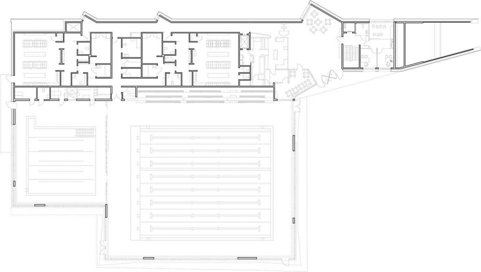 ▼低处的楼层包含体育馆、多功能厅、设备间和办公设施