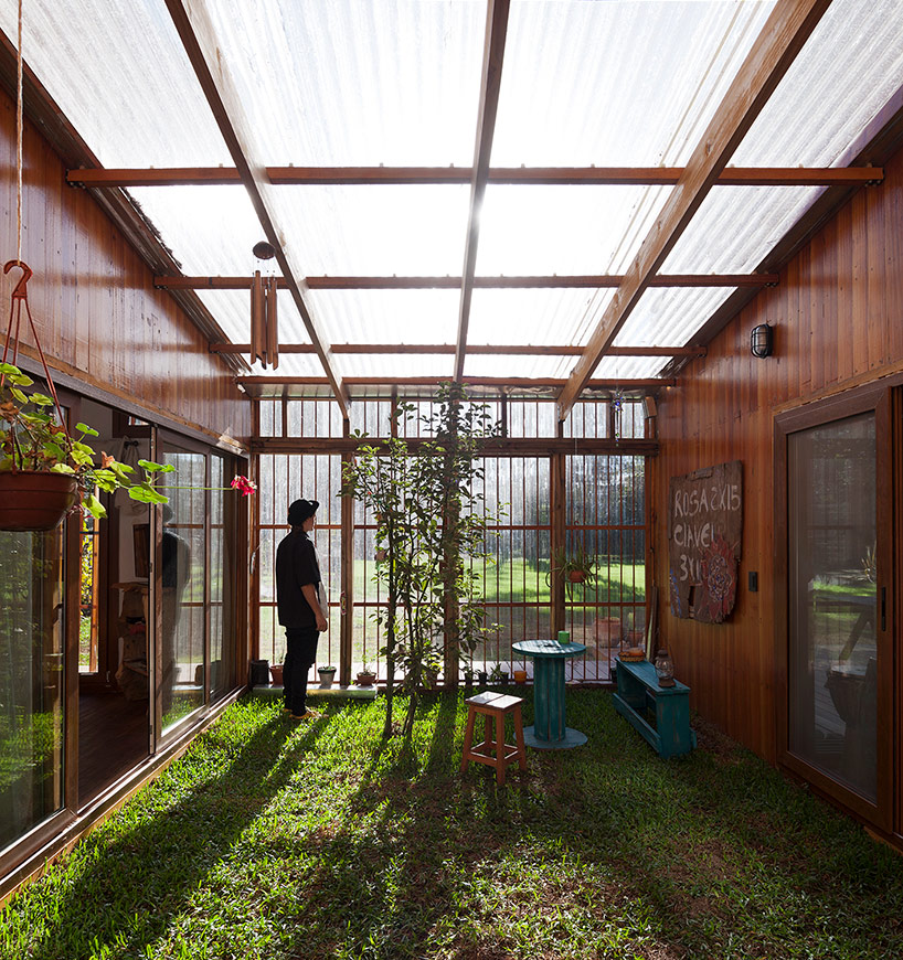 穿插在住宅当中的绿色庭院,通向起居空间、办公空间和主卧。