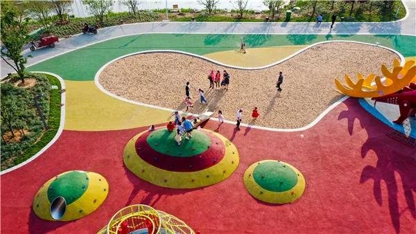 与花海两两相望的亲子乐园,孩子们的欢笑声随着秋千飘到天上,推秋千的大人难掩笑意,人与人之间变得柔软。