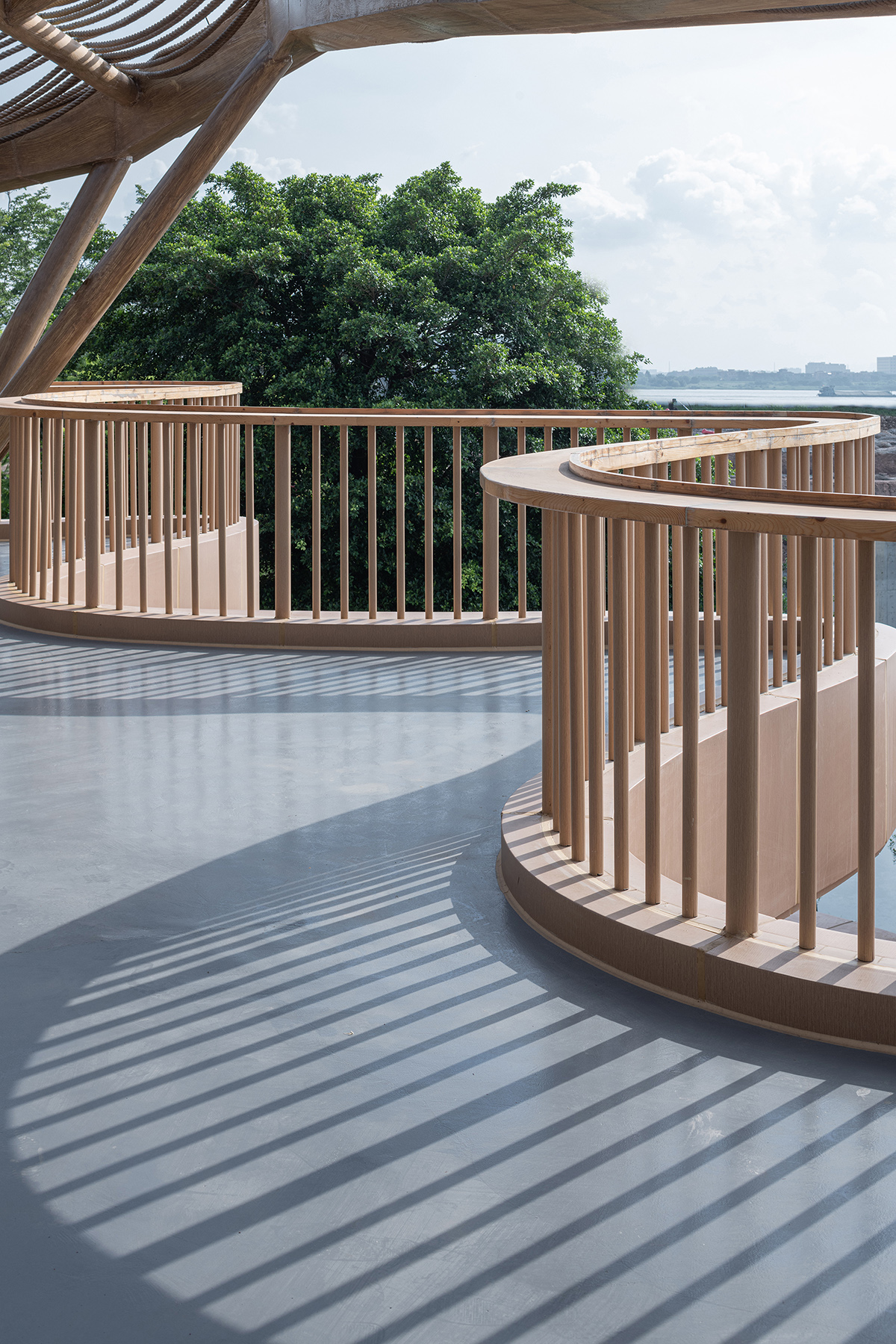 屋顶采用当地天然材料麻绳遮阳,在保证了整体建筑完整性的同时,将地域生态的材料用现代悬挂的形式呈现,提升了屋顶观览区的观赏性,使整个建筑也成为了一道靓丽的风景线。