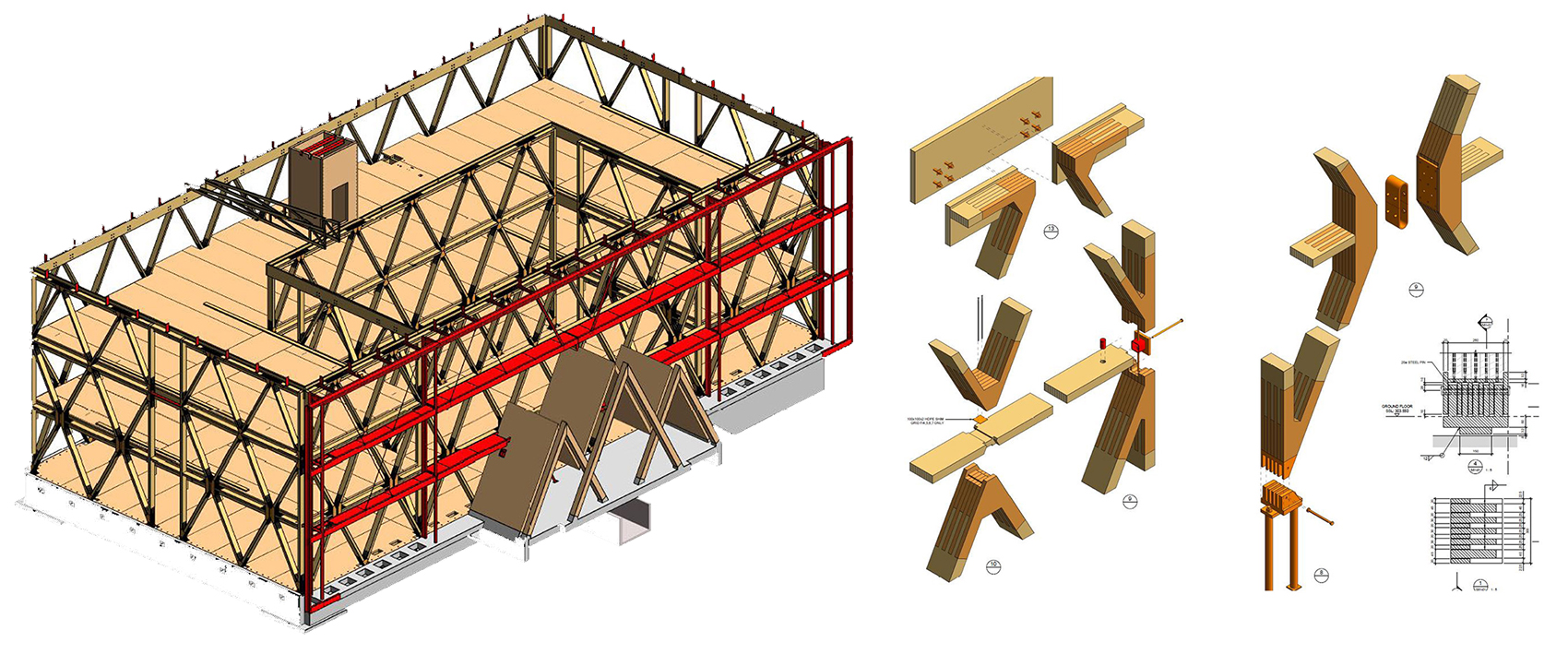 木制的斜梁作为本项目中最为鲜明的建筑语言,向人们展现出木结构建筑与钢筋混凝土建筑的不同,这些斜梁就如同真实的树枝,建筑的荷载随着木材的纹理被逐渐消解,保证了整体结构的强度。在本项目中,设计采用了一种创新式的木结构节点转移荷载,结构中还置入了可替换的抗震装置。